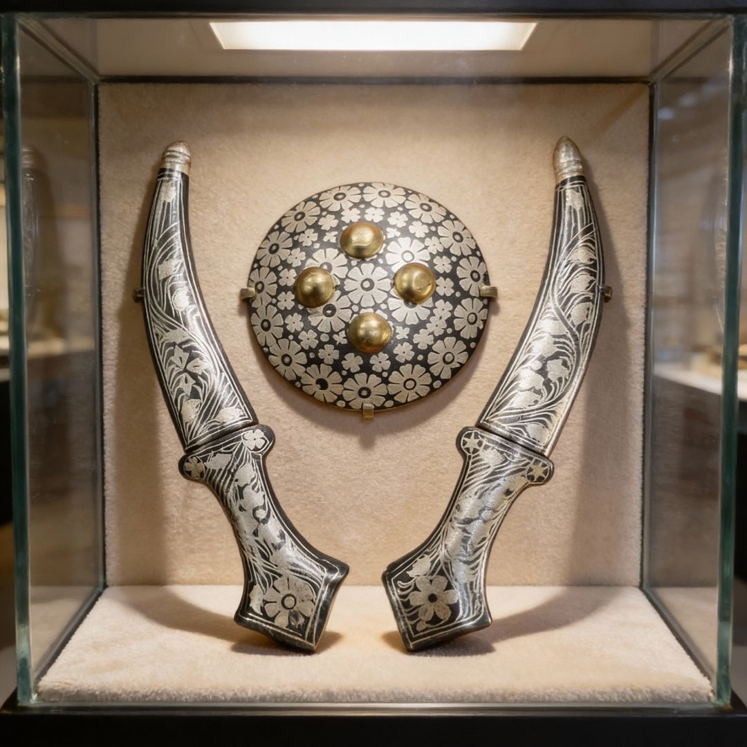 Created as decorative artefacts, this Koftgari dagger pair is well suited for curated collections, display shelves, desks, or heritage-inspired interiors where smaller art objects are appreciated. It works well as a subtle display accent, carrying symbolic value and traditional artistry in a refined form. The pair is intended for visual appreciation and ornamental storytelling rather than functional use.