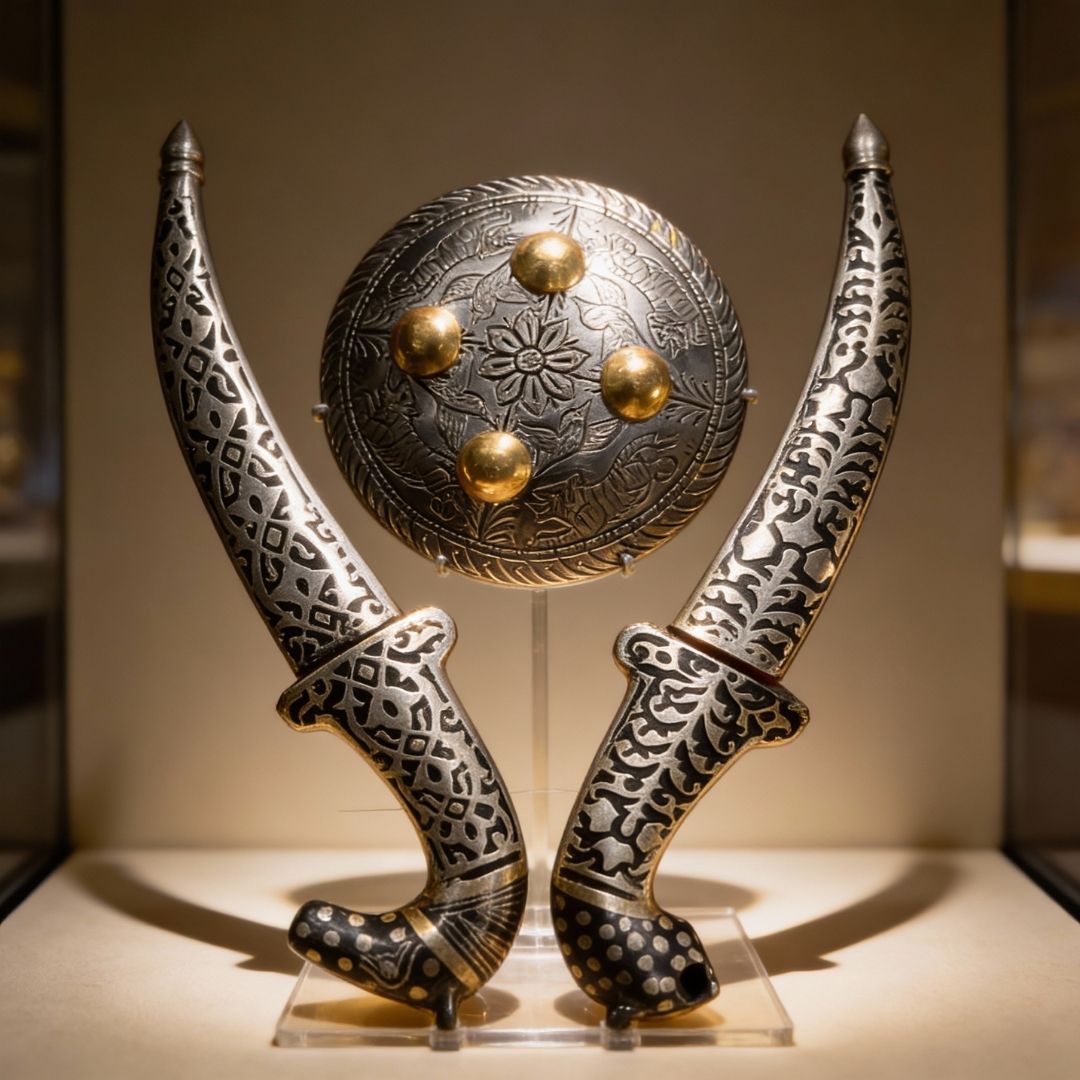 Created as decorative artefacts, this Koftgari dagger set is well suited for curated collections, display shelves, desks, or heritage-inspired interiors where refined craftsmanship is appreciated. It works beautifully as a subtle accent piece, carrying symbolic value and traditional artistry in a restrained form. The set is intended for visual appreciation and ornamental storytelling rather than functional use.