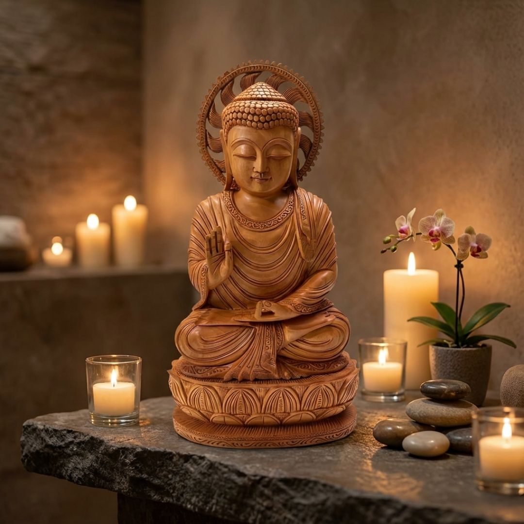 This Lord Buddha meditation sculpture is carved in pure sandalwood. The artwork shows Buddha seated in a serene meditation pose on a finely carved lotus base that represents calm, clarity and spiritual grounding. The smooth contours, subtle facial expression and structured robe detailing highlight the quality of hand craftsmanship that has long been associated with premium sandalwood carving. Each feature is shaped to bring depth and meaning to the sculpture, making it a beautiful reflection of traditional Indian artistry.
