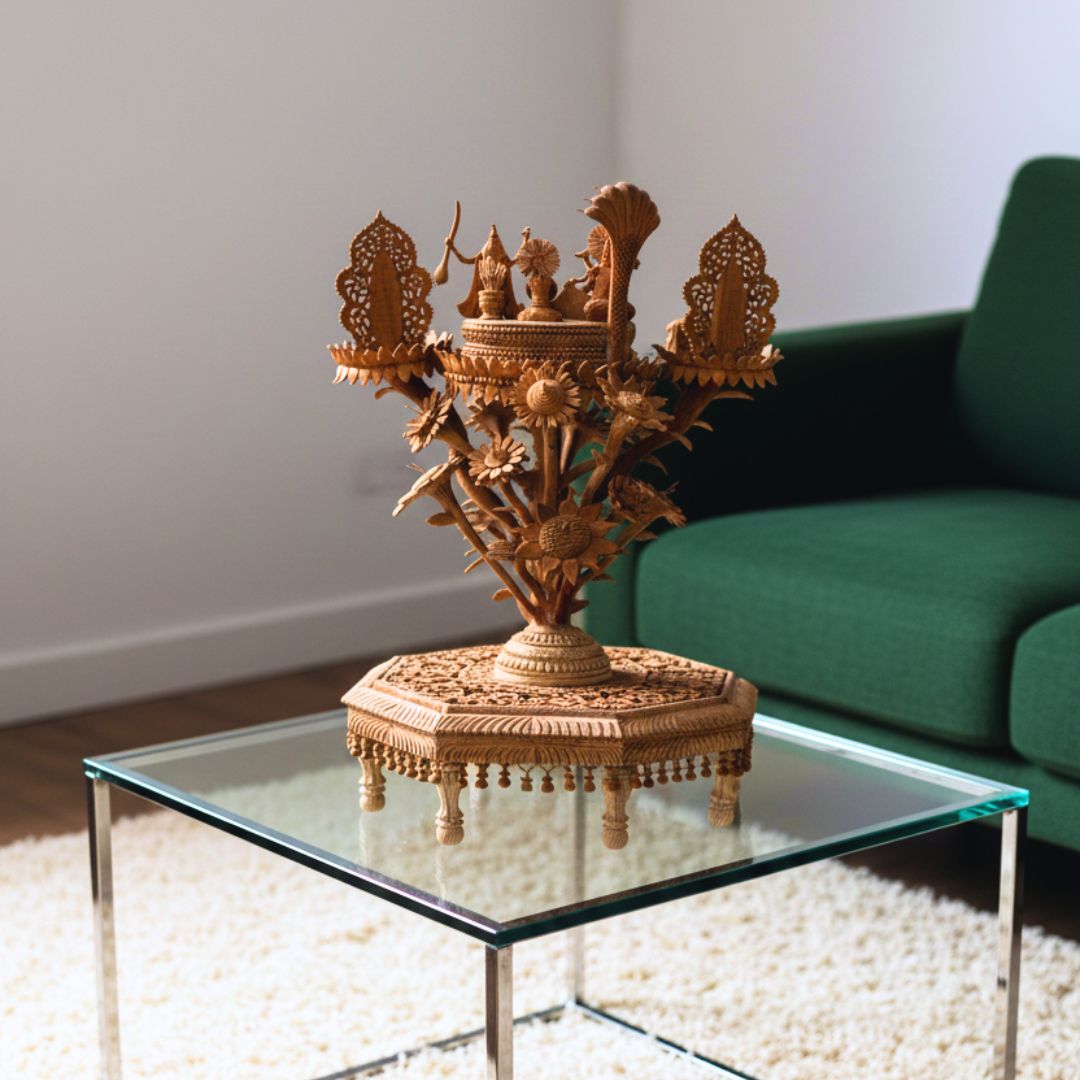 Every miniature motif, crown, ornament and seated form is shaped in natural sandalwood, allowing the fragrance, grain and warmth of the wood to enhance the sense of sanctity. Designed as a collectible that blends devotion with premium craftsmanship, the piece works as both artistic décor and a spiritual centrepiece.