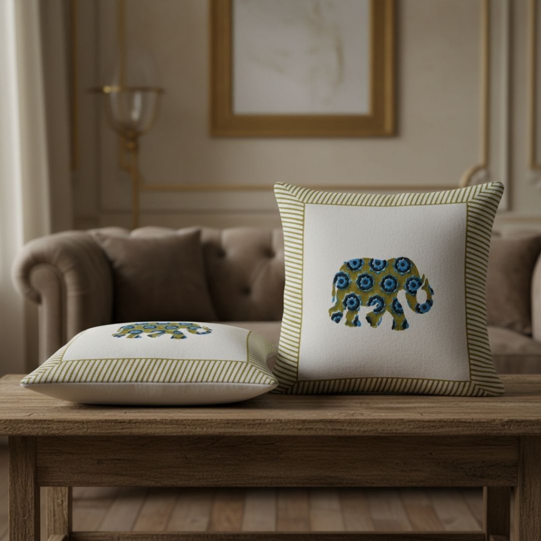 Hand Block Printed Cotton Cushion Covers with Central Elephant Motif (Set of 2)
