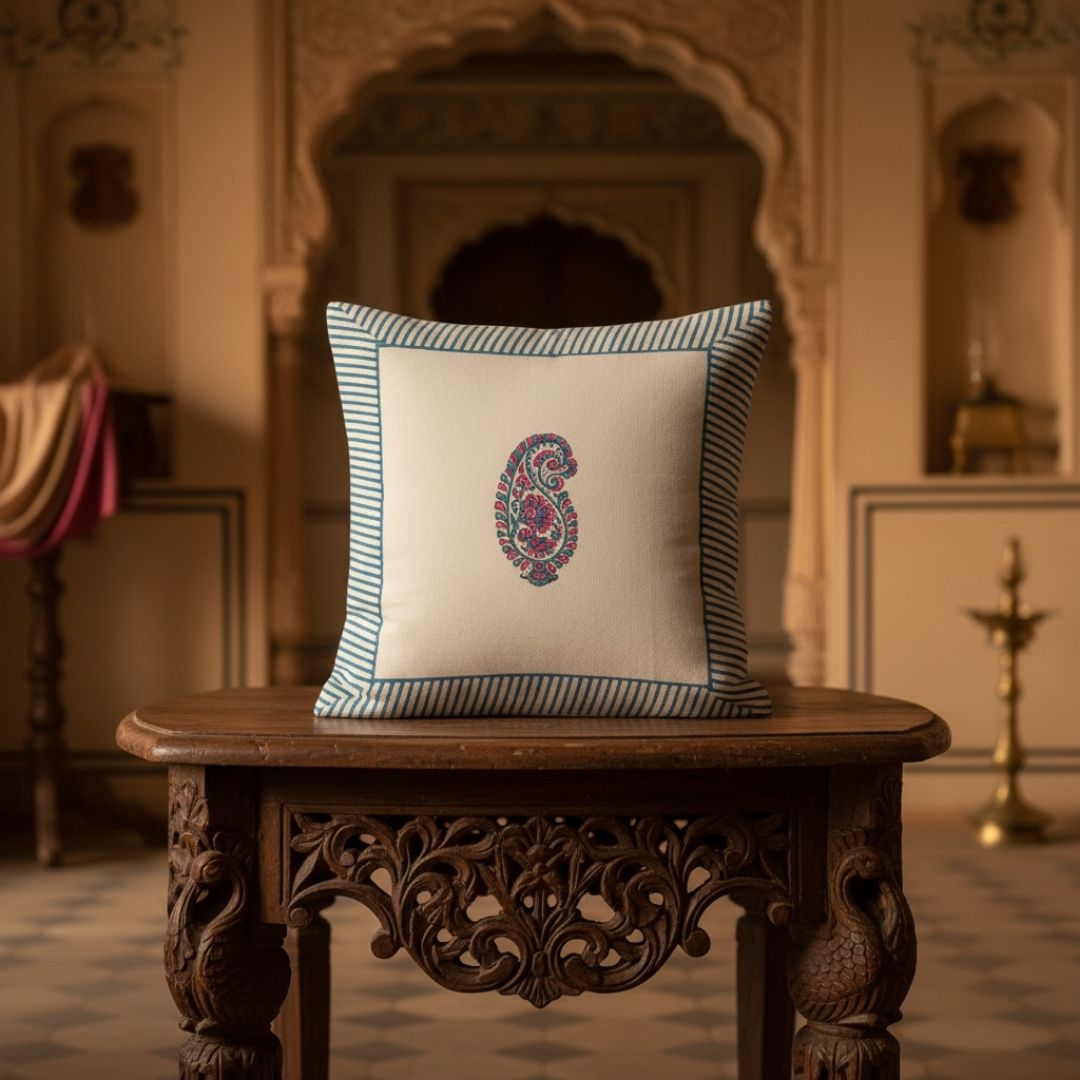 These cushion covers are crafted from soft south cotton and feature a clean, structured design with a hand block printed motif placed at the centre. A subtle blue border frames the composition, giving the covers a balanced and finished look while keeping the overall feel light and uncluttered. The breathable cotton fabric remains smooth and comfortable, making them suitable for everyday use across seasons.