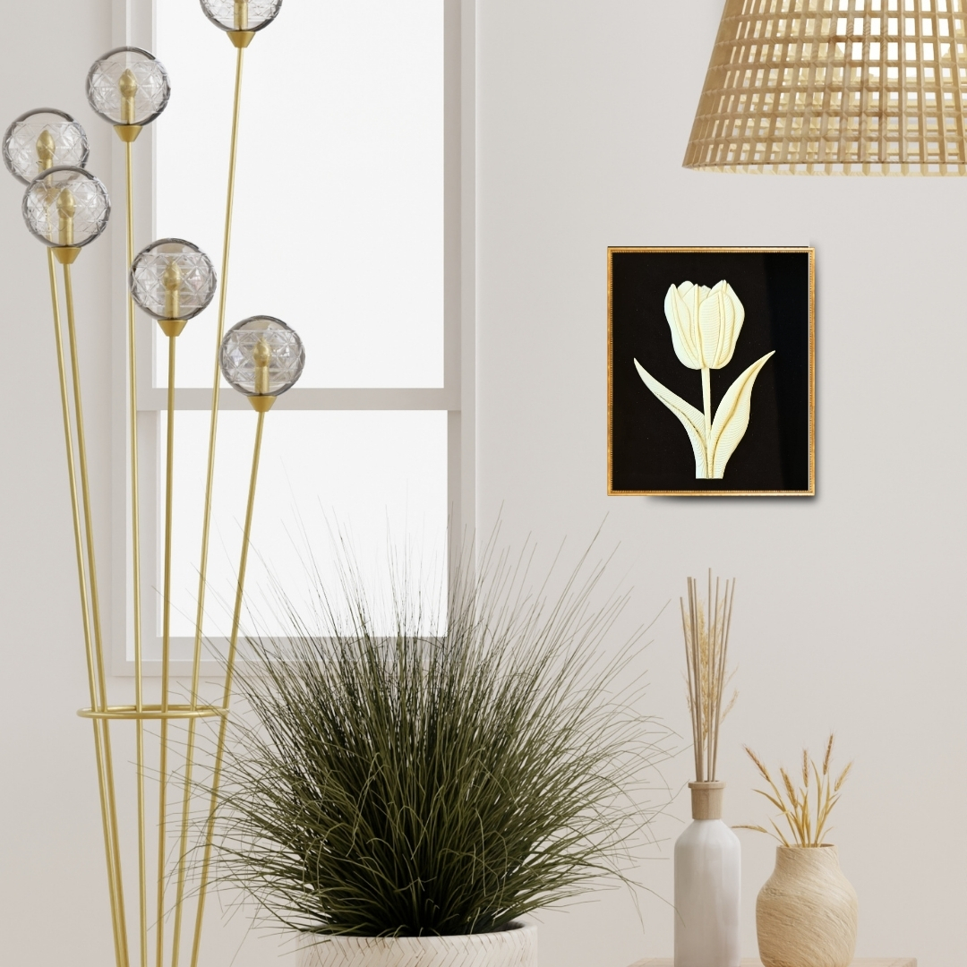 Intricate Tulip takes Chhajed’s floral studies further, emphasizing structure within fragility. Each vein and fold is hand-carved, giving the flower dimensional precision. The subtle interplay of shadow and highlight under glass makes it appear almost sculptural.