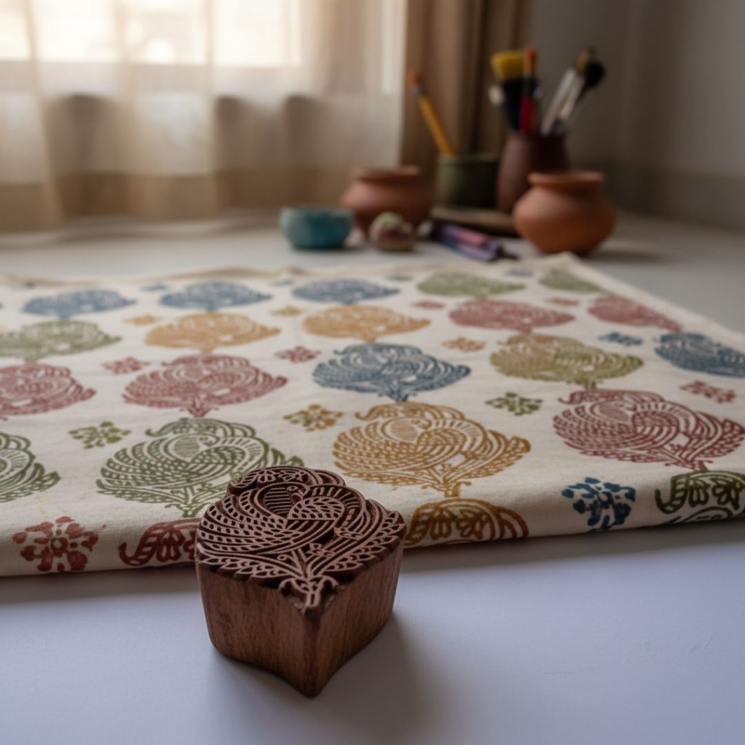The sturdy Gurjan wood construction ensures long-lasting use, while the comfortable grip makes the block easy to handle and control. This peacock motif block works beautifully for textile printing, border designs, accent motifs, and repeat patterns. It can also be used for paper decoration, clay impressions, terracotta work, and creative DIY projects. Beyond functionality, the block reflects the richness of traditional Indian woodblock carving, making it both a practical printing tool and a collectible craft piece.