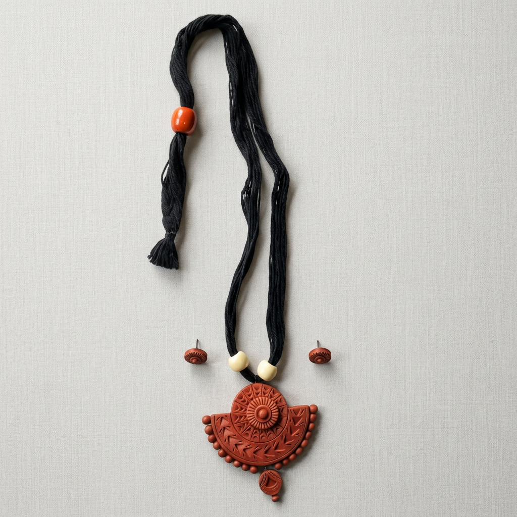 The set reflects the long-standing tradition of terracotta craftsmanship in India, where clay has been used to create decorative objects and jewellery for generations. Individual clay components are moulded, dried, and fired before being assembled into a coordinated set. The necklace and matching earrings are designed to complement one another, creating a balanced look that combines traditional artistry with modern wearability.