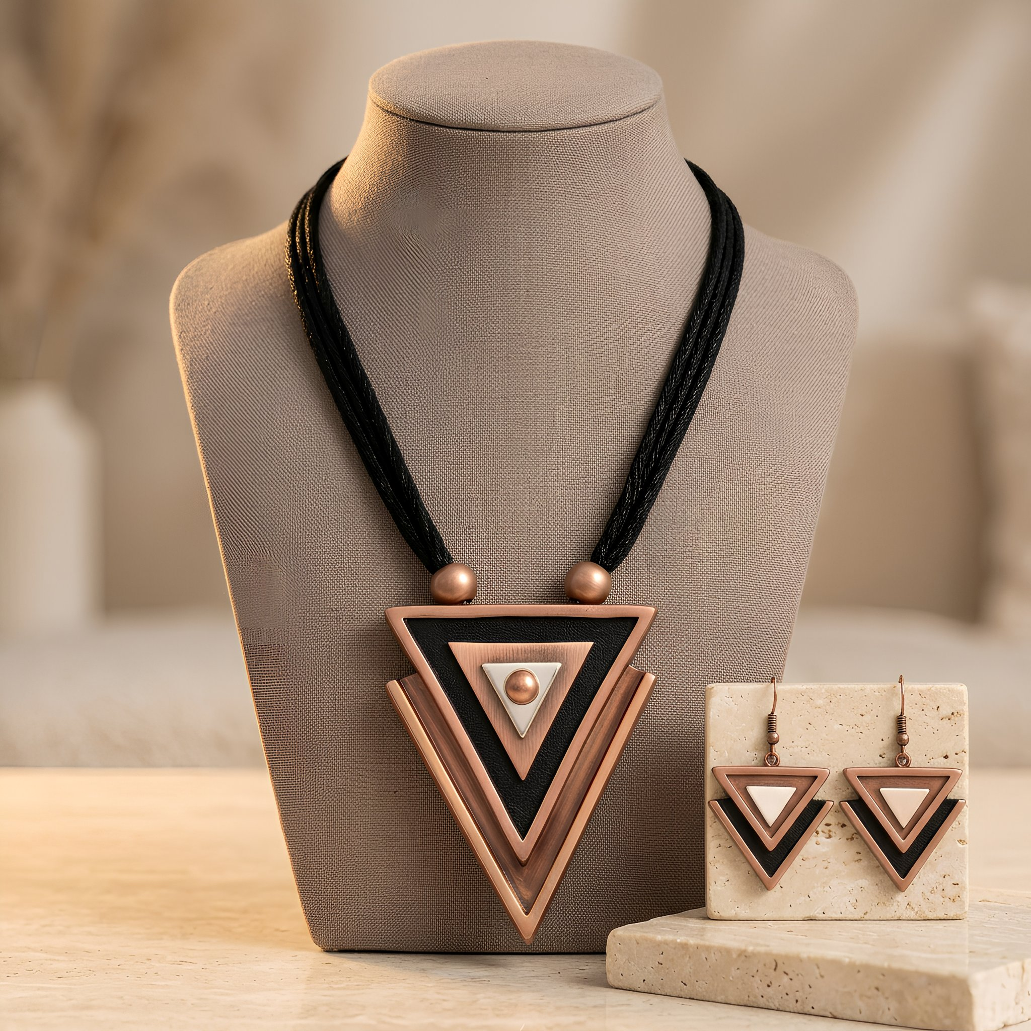 The design draws from the rich tradition of terracotta craftsmanship in India, where clay has long been shaped into decorative and ceremonial objects. In this set, clay components are moulded, dried, and fired before being assembled into a coordinated necklace and matching earrings. The shapes balance ornamentation with simplicity, allowing the natural charm of terracotta to remain the central visual element.