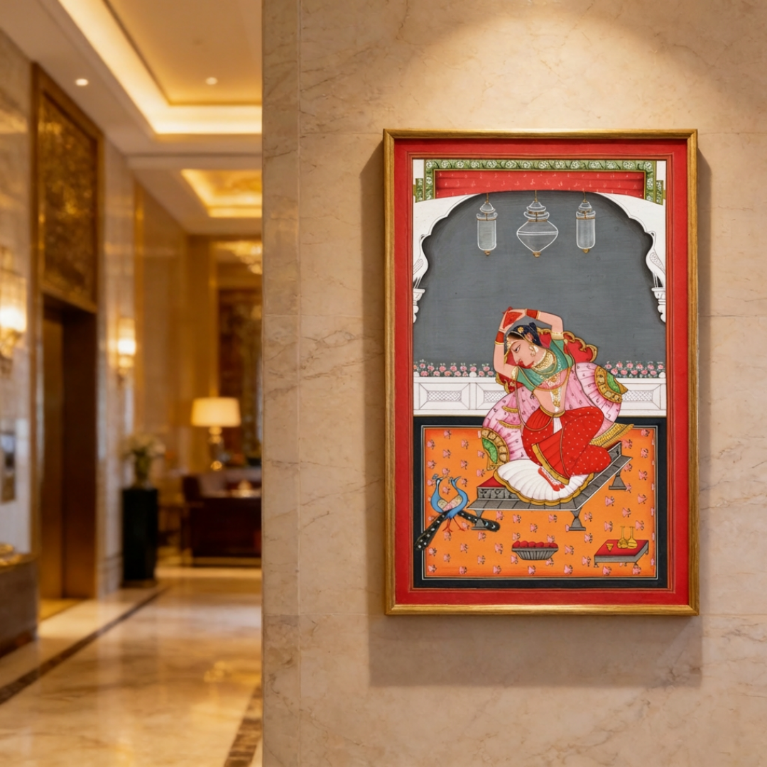 Executed with delicate brushwork and controlled colour, the painting highlights the refined craftsmanship associated with Rajput miniature traditions. Fine outlines define the figure’s posture, while soft hues and decorative details enrich the surrounding environment. Rather than presenting grandeur or spectacle, NAYIKA-01 Yawning Nayika in Kotah School captures a fleeting human moment, turning an ordinary gesture into a lyrical expression of mood, time, and quiet introspection.