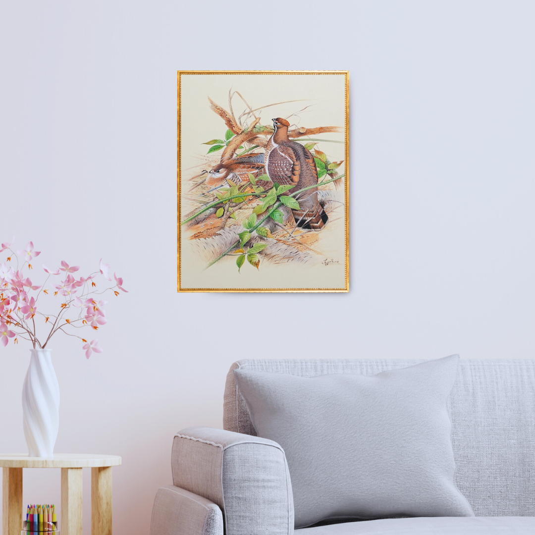 Nestled amidst gnarled twigs and disrupted-looking foliage, a pair of grouse, one crested sentinel gazing outward, the other folded in protective repose, embody a union untouched by autumn's fade or winter's hush. Their wings and feathers are painted with such delicacy that each seems to catch the invisible yet pervasive sunlight. Standing by each other even in environments as disrupted as portrayed in the painting suggests a mate-bond that defies seasonal moult and migration; could this painting's title 'A Bond Beyond Seasons' be referring to the quiet pledge of lifelong companionship, enduring beyond fleeting blooms?