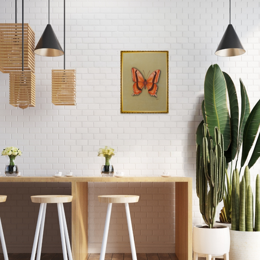Amber Mirage by Jaggu Prasad captures the ethereal elegance of a butterfly in warm amber and burnt orange tones. The artist’s expert use of shading and gradient brings out the delicate textures of the wings, creating a lifelike and captivating composition.