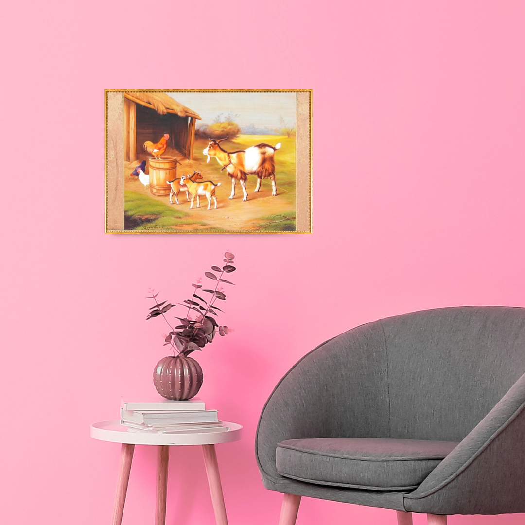 In 'Bearded Wanderers', Jaggu Prasad paints an affectionate glimpse of pastoral life, a family of goats and a few barnyard companions gathered outside a humble shed. The golden light glances softly across their coats, revealing every texture — from the coarse fur of the adults to the downy softness of the kids. Prasad’s brush captures their curiosity and calm with the same quiet reverence he gives to his wild subjects, blurring the line between domestic and untamed grace. The setting, a sun-warmed countryside shelter, punctuated by gentle earthy tones, reflects a simple rhythm of coexistence. It is a tender moment, translated through the discipline of miniature realism.