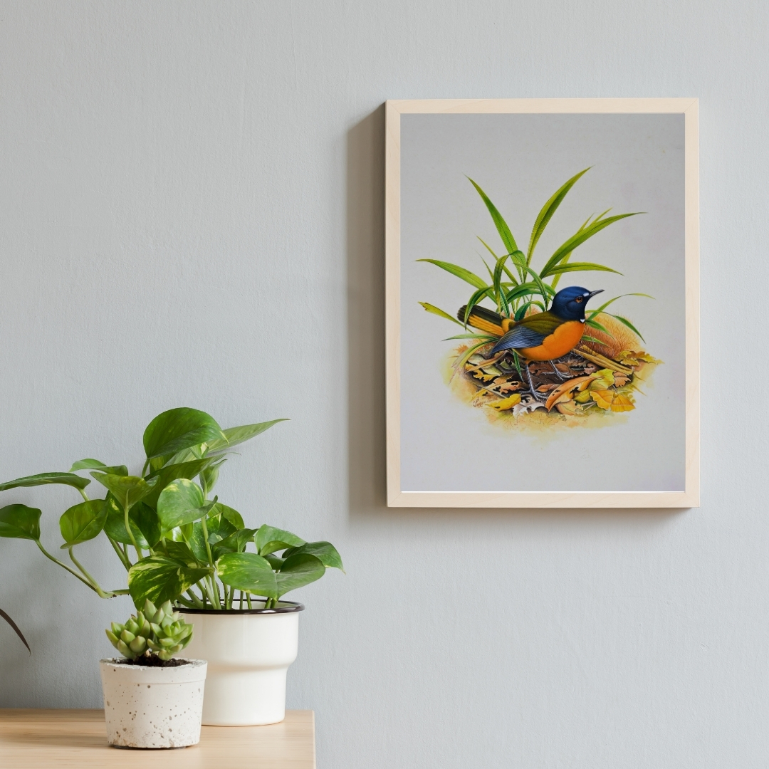 Forest Groundbird by Jaggu Prasad presents a small bird resting among dry leaves and blades of grass. The artist uses measured colour transitions to bring depth to the blue, orange, and olive tones of the bird’s feathers. Each element, from the texture of the soil to the curve of the leaves, is painted with patient precision.