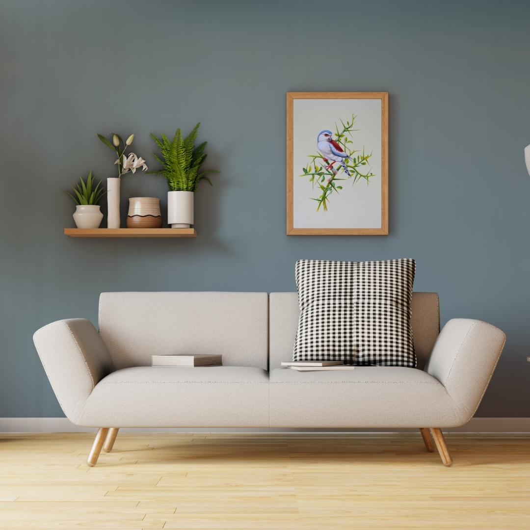 Thorn Sentinel by Jaggu Prasad portrays a small bird perched carefully on a branch lined with thorns. The red, white, and grey tones in its feathers are painted with quiet control, each line contributing to the bird’s alert yet composed posture. The green buds surrounding the branch soften the setting, creating a measured contrast between sharpness and calm.