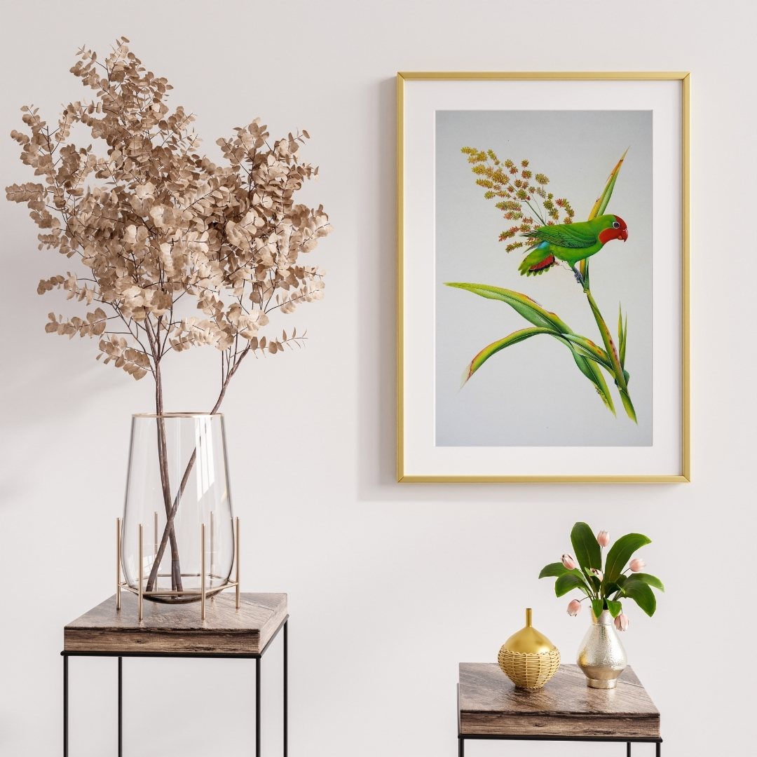 Green Parakeet by Jaggu Prasad portrays a parakeet perched on a tall grass stalk in bloom. The artist captures the bird’s posture with patience, its bright green feathers carefully balanced against the soft red tones of its face and tail. Each leaf and grain cluster is painted with calm precision, giving the composition both clarity and rhythm.