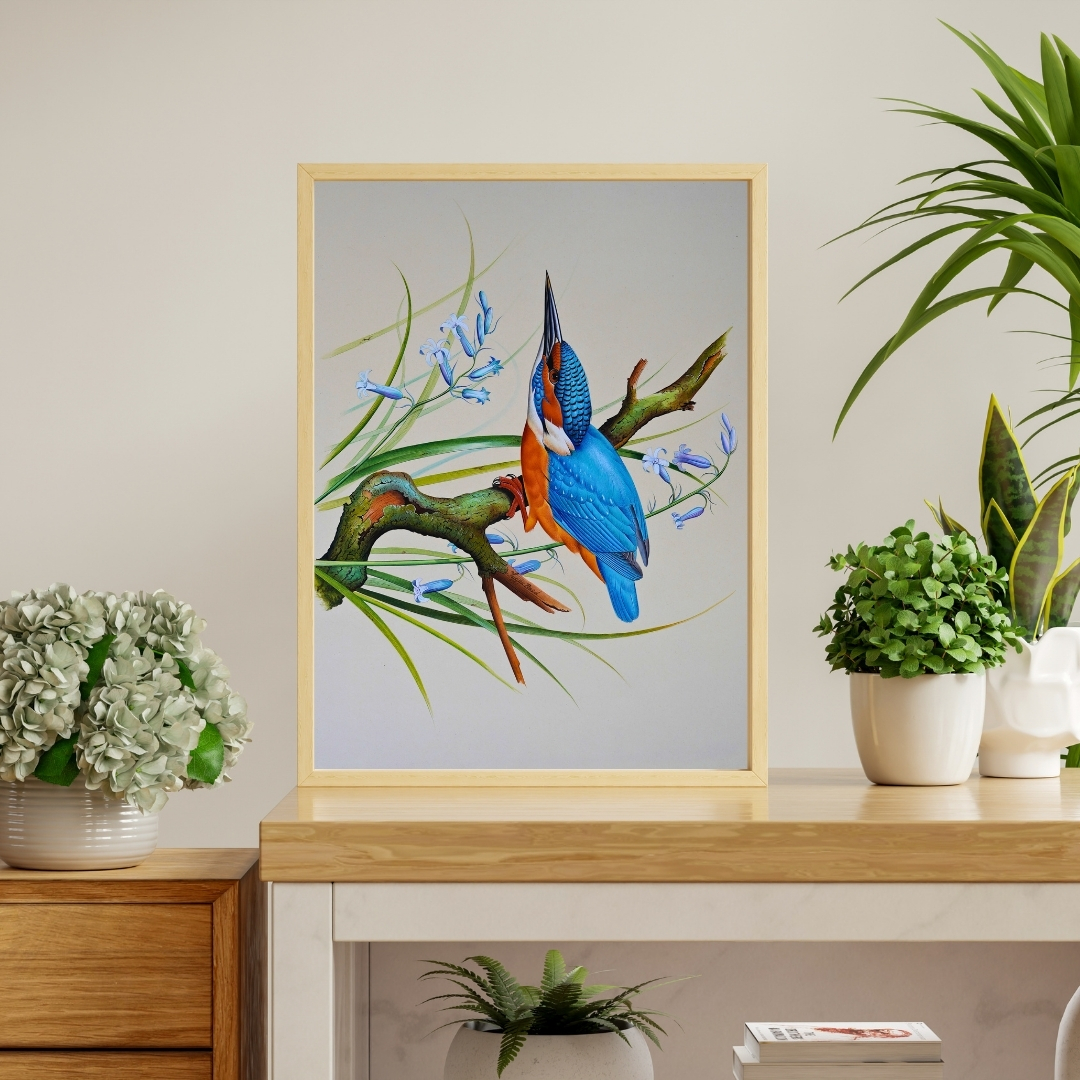 Azure Kingfisher by Jaggu Prasad portrays a kingfisher poised on a moss-covered branch, its sharp beak tilted upward, wings at ease. The blue of its feathers merges seamlessly into the pale background, while the orange of its chest warms the scene. Each brushstroke feels attentive, revealing both motion and calm.