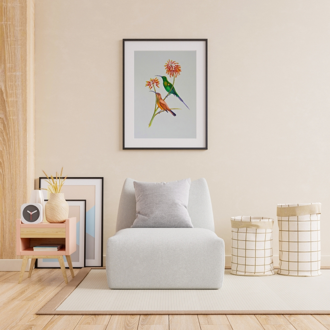 Flame Blossoms by Jaggu Prasad captures two slender birds poised among orange blooms. One gleams in green, the other in soft amber, their curved beaks echoing the arc of the stems. The brushwork is delicate, with fine gradations of tone that bring the scene to quiet life.