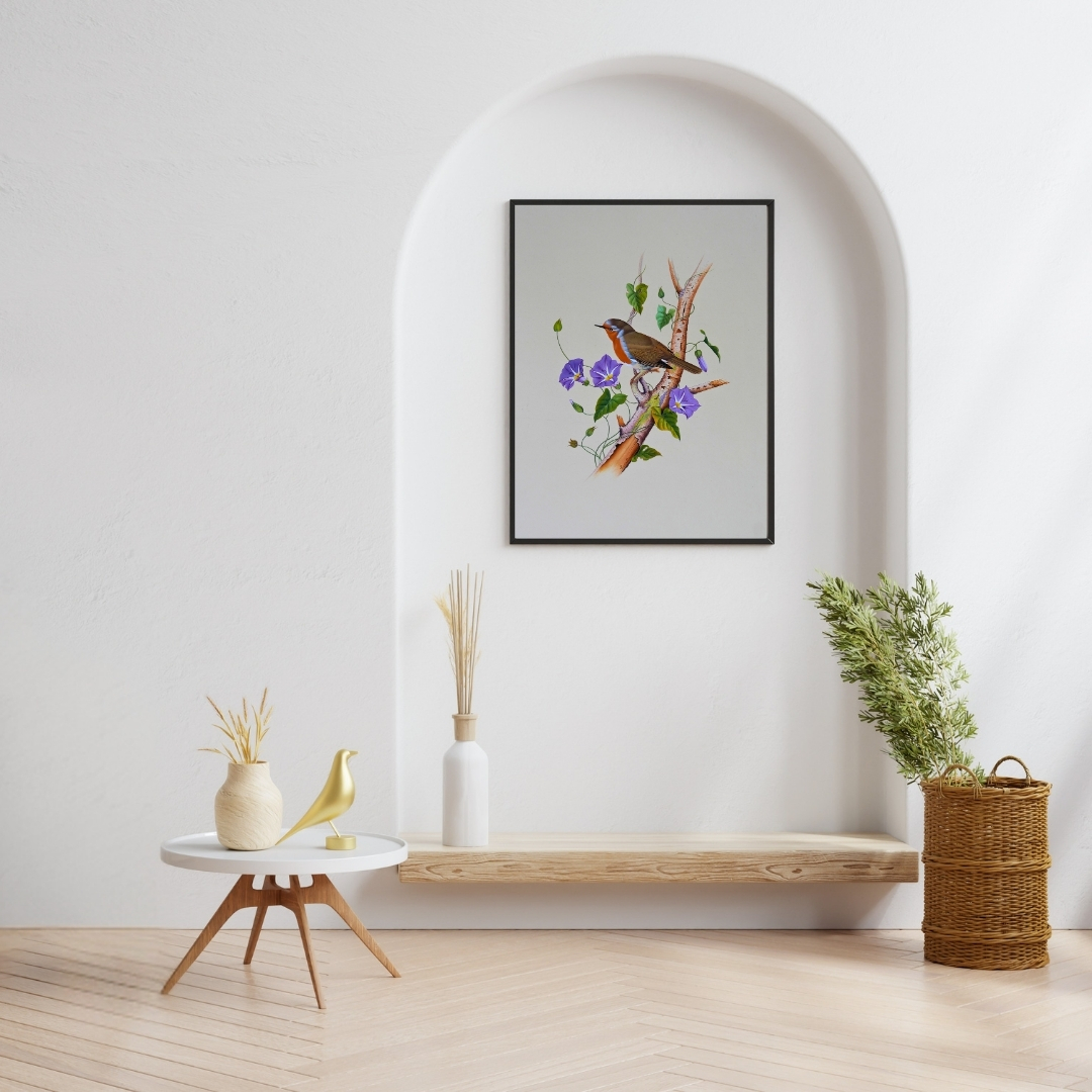 Violet Perch by Jaggu Prasad captures a small bird resting on a branch surrounded by violet flowers. The composition is calm and measured, with soft contrasts between the bird’s warm plumage and the cool blooms that frame it. The slender branch and curling tendrils add a sense of movement without disturbing the stillness.