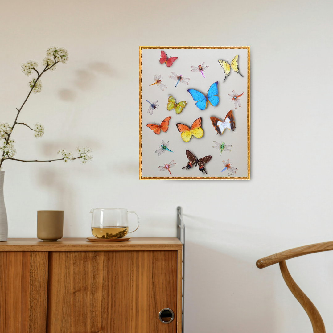 Blossom Dance' by Jaggu Prasad unites butterflies and dragonflies in a luminous celebration of colour and harmony. Shades of sapphire, amber, and lemon drift across the canvas like petals caught in gentle air. The artist’s meticulous brushwork captures each translucent wing and minute vein, transforming the insects into living jewels. The arrangement feels spontaneous yet deeply balanced, as if nature itself choreographed this delicate convergence. The interplay of butterflies and dragonflies evokes a meeting between bloom and breeze, where two worlds of grace coexist in effortless rhythm. The coming together of these two species, of butterflies and fireflies, is portrayed as a dance, a meddley of two distinct forms of beauty that gives this painting the sense of a merging, a communion.
