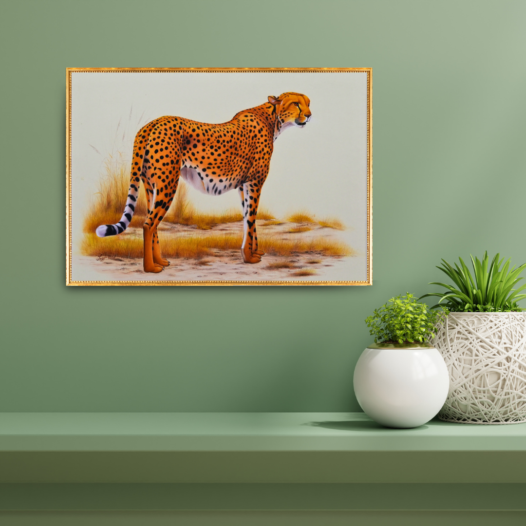 In 'Born of Lightning', Jaggu Prasad channels the raw elegance of the cheetah — poised mid-turn, its sinewy body crackling with restrained speed. Each spot, each muscle, is captured with meticulous precision, conveying motion even in stillness. The cheetah’s amber coat glows against the pale backdrop of dry grass, a study in contrasts — fragility of terrain against the certainty of the predator. The artist’s brush seems to hum with energy, tracing the fleeting power of nature’s swiftest creation.