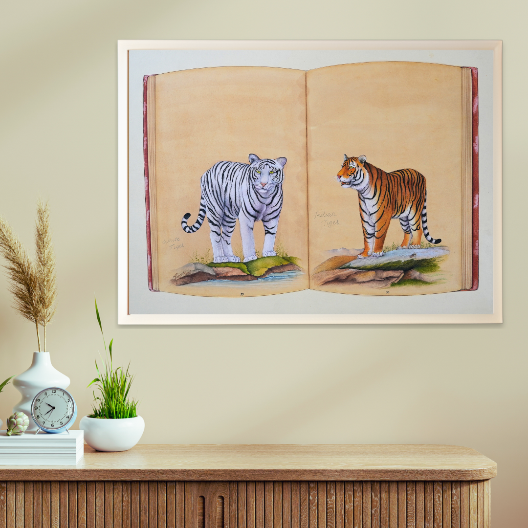 Botanical Compendium by Jaggu Prasad captures the quiet majesty of two tigers, one white and one royal Bengal, standing gracefully across the open pages of a painted book. The artist’s delicate brushwork brings both strength and serenity into balance, transforming this natural study into a timeless reflection of beauty and discipline.