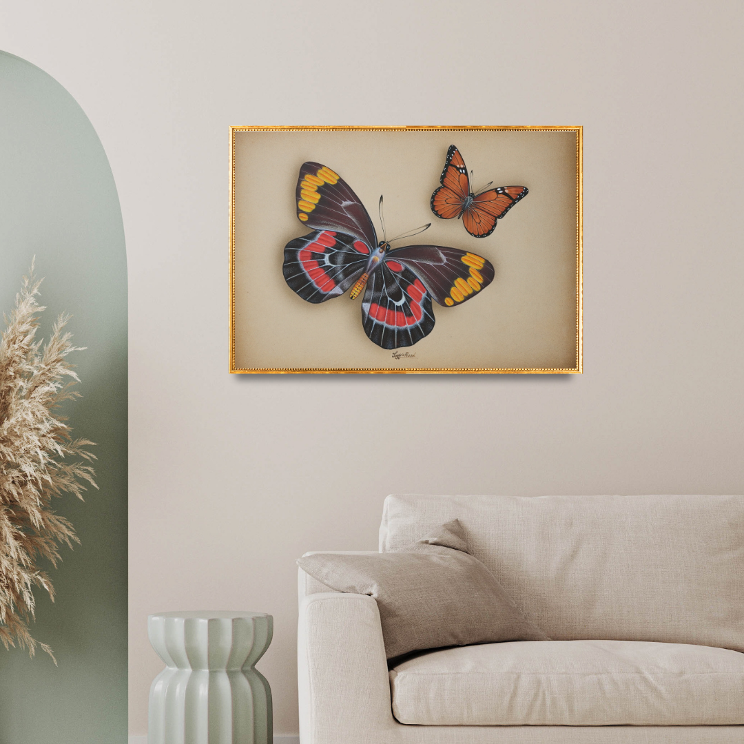 Crimson Echoes by Jaggu Prasad is a striking portrayal of two butterflies poised in mid-flight. The larger butterfly, with its deep crimson and charcoal wings accented by touches of gold, exudes power and elegance, while the smaller orange companion adds warmth and balance. The soft parchment backdrop enhances their vivid hues, allowing the composition to breathe with poise and clarity.