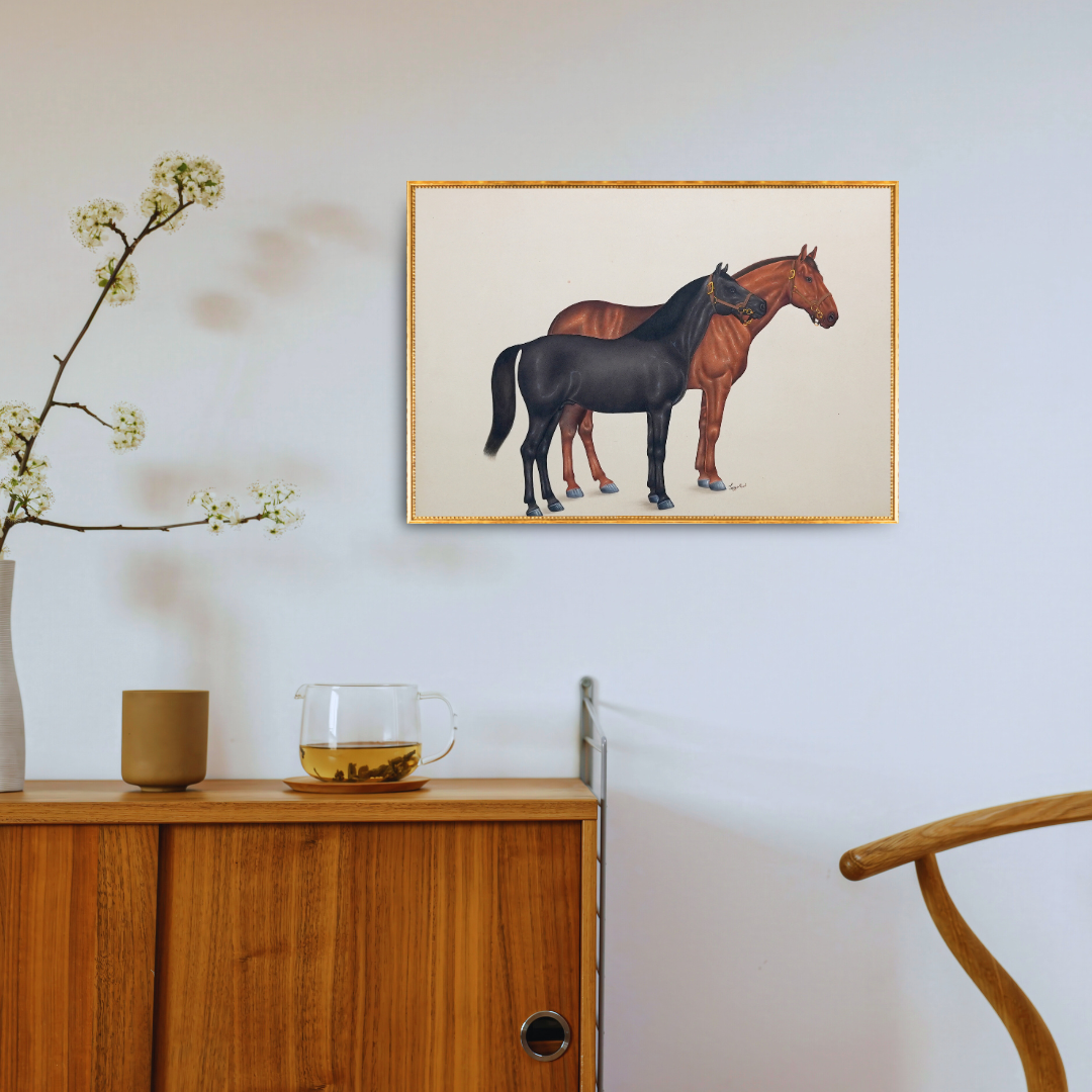 "In 'Crown of the Plains', Jaggu Prasad celebrates the quiet nobility of horses with an elegance that borders on reverence. The two figures, one chestnut, one onyx, stand side by side, their forms balanced like counterparts in a living sculpture. Through the soft sheen of watercolour, Prasad captures every muscle, every subtle tension beneath the skin, revealing both strength and composure. The horses’ calm gazes and upright posture evoke a regal stillness, as though they are aware of their lineage, creatures shaped by endurance, grace, and loyalty. The artist’s restrained palette heightens the realism, allowing light to breathe over their polished coats while the neutral background keeps all focus on their proud silhouettes.