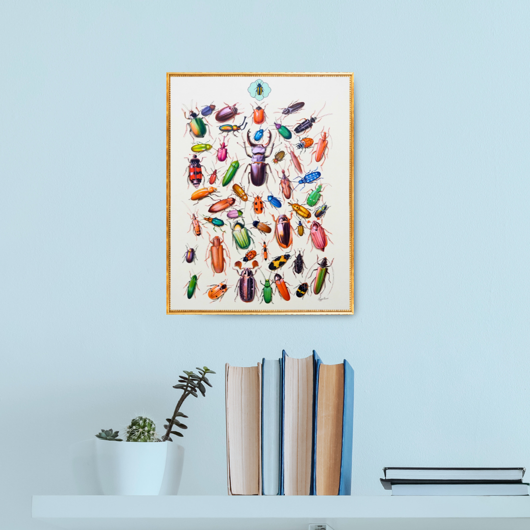 In 'Divine in Design', Jaggu Prasad turns the overlooked world of beetles into a revelation of symmetry and splendour. Across the composition, iridescent greens, bronzes, and crimsons gleam like jewels scattered by nature’s own hand. Each beetle, from the delicate ladybird to the imposing stag beetle at the centre, is painted with a jeweller’s precision, revealing the intricate logic and artistry embedded in their forms. Prasad arranges them not as specimens, but as emissaries of natural intelligence, each one a fragment of a greater pattern. The title feels apt: within their armour and gloss lies design so exact it borders on the sacred. This painting is like an appreciation-piece for Nature's beauty, pattern and deliberate design.