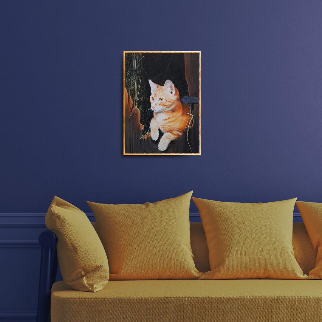 In 'Dreaming in Silence', Jaggu Prasad paints a moment of gentle introspection—a ginger cat resting at a wooden threshold, its eyes half-lost in reverie. The soft glow of fur, the aged grain of the timber, the glint of straw, every surface is touched by quiet precision. Light and shadow converse in perfect equilibrium, framing a meditation on calm awareness. Beneath this simple scene lies a subtle emotional architecture: the comfort of stillness, the poise of observation, the tender melancholy of waiting. Prasad distills the feline temperament, independent and inward, into a single suspended instant.