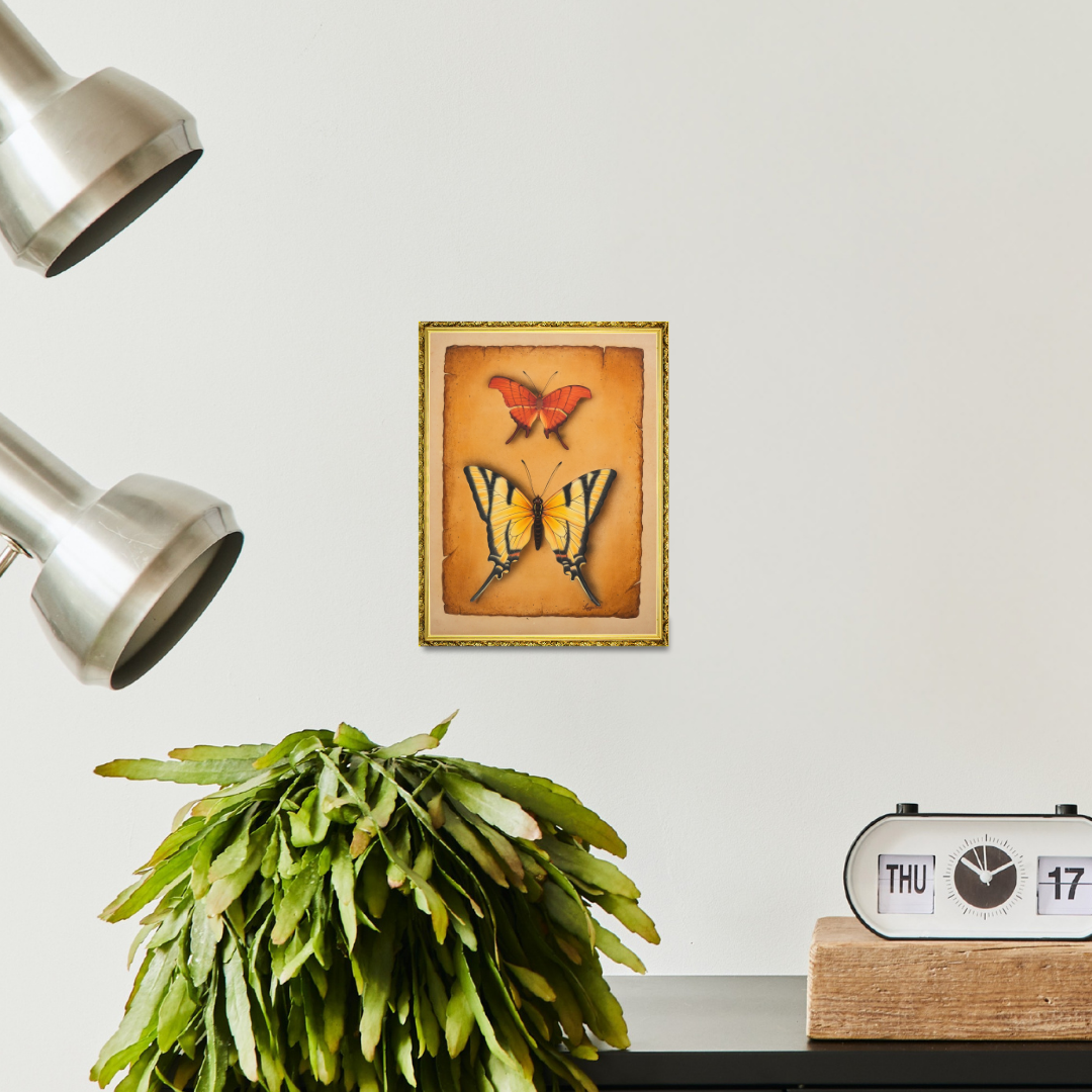 The textured parchment-like background adds depth and warmth, enhancing the lifelike quality of the butterflies while lending the artwork a timeless aura. Each brushstroke by the artist is carefully measured, highlighting the fragile patterns and soft gradients of the wings. Echoes of Grace is a serene miniature that captures a fleeting yet eternal beauty found in nature’s smallest wonders.