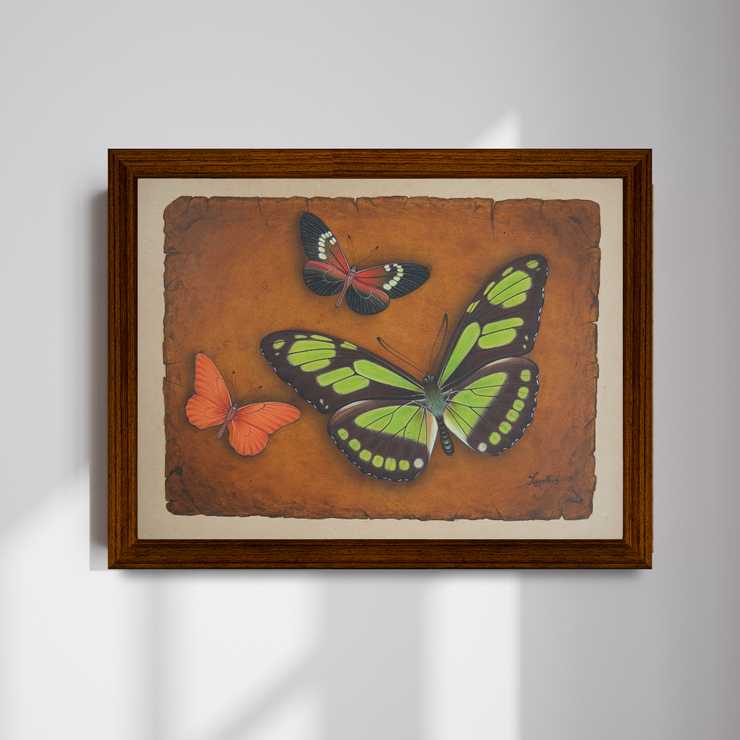 Emerald Flight by Jaggu Prasad captures a moment of delicate stillness, where three butterflies rest against a softly textured background. The central butterfly, painted in striking shades of green and black, radiates quiet strength, while the accompanying orange and coral butterflies bring warmth and contrast to the composition.