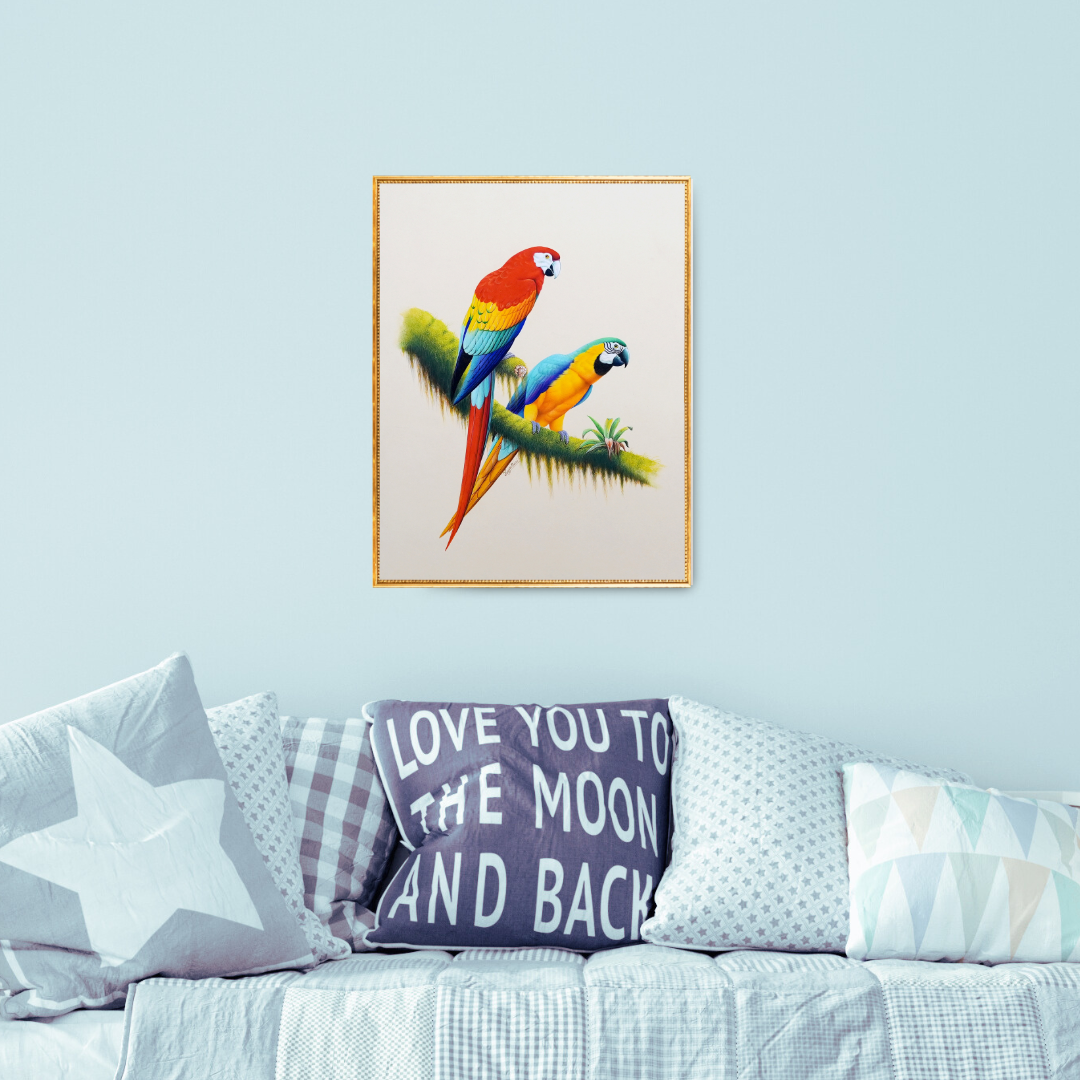 There’s a certain glow in “Forest Jewels” that feels like sunlight filtered through the leaves of a tree. The macaws here are rendered with such minute attention that even the texture of their beaks and claws seem tangible. Jaggu Prasad paints them not as static subjects, but as living jewels — vibrant, elusive, and full of character. Their mutual gaze carries both affection and alertness, echoing the timeless rhythm of the forest they inhabit. The painting’s title gives these colourful and radiant birds the status of a jewel. Perfectly articulating how they enhance and act as decorative elements to the dark and green-brown consistency of the woods.