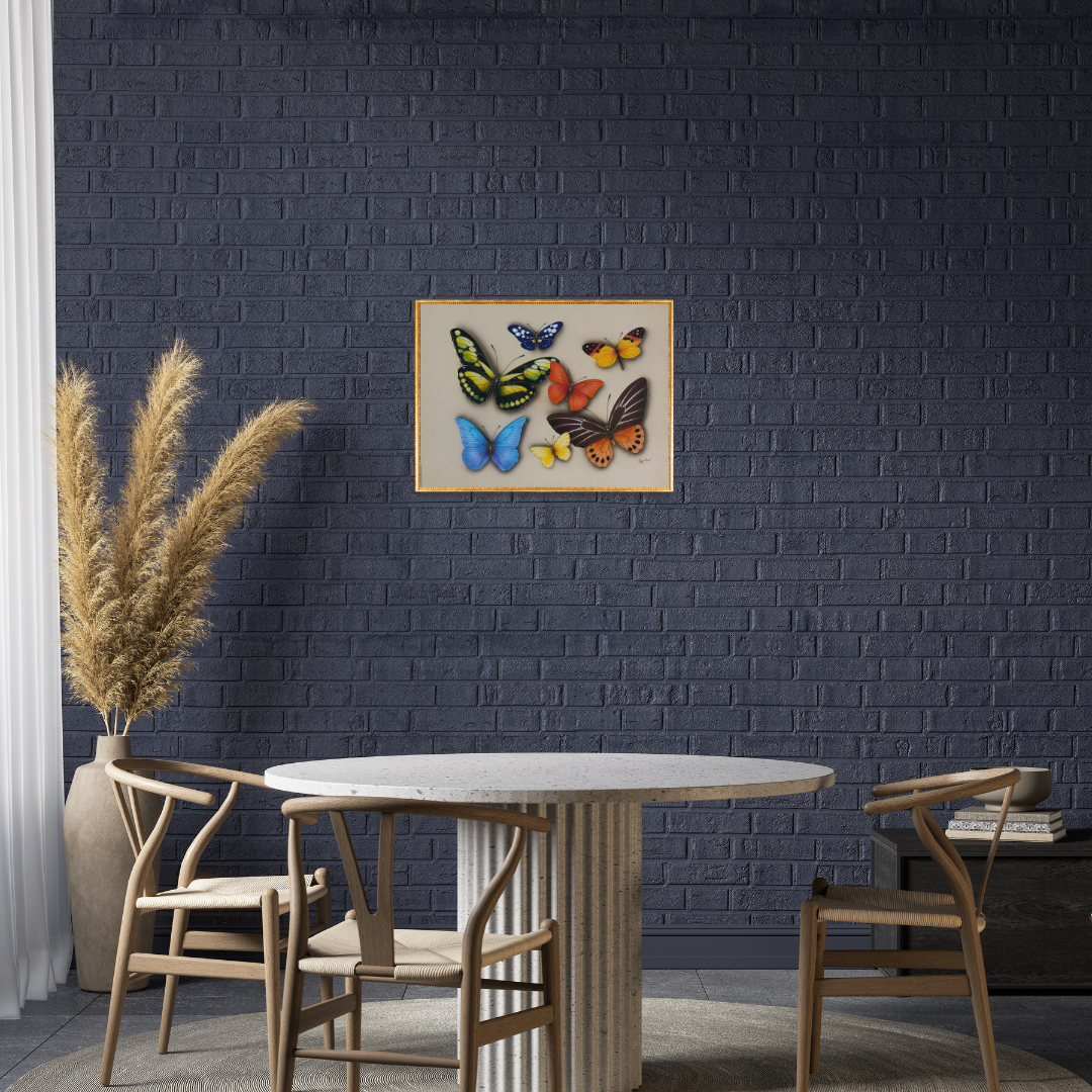 - A dynamic yet balanced composition featuring diverse wing patterns and colour