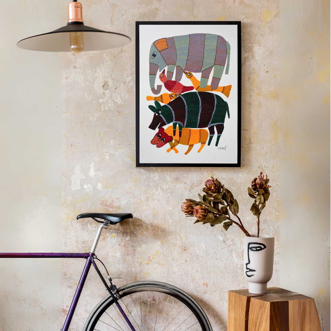 Ram Bai in her artwork The Creatures of Jungle has used the medium of vibrant pigments and intricate detailing in Gond's art enhances the painting’s emphasis on the vitality and energy of wild animals. The bold, contrasting colors and fluid lines amplify the raw power and essence of the jungle’s creatures, conveying their freedom and strength. The texture and vividness reflect the deep connection between the Gond people and the natural world, imbuing the animals with spiritual significance. This choice helps to elevate the animals beyond representation, highlighting their symbolic role in the ecosystem and Gond culture.
