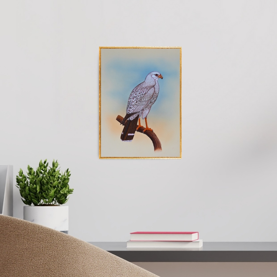 Ivory Sentinel by Jaggu Prasad portrays a pale hawk resting on a curved branch under a softly diffused sky. The artist’s attention to symmetry and structure brings quiet grandeur to the bird’s stance, where strength meets grace.
