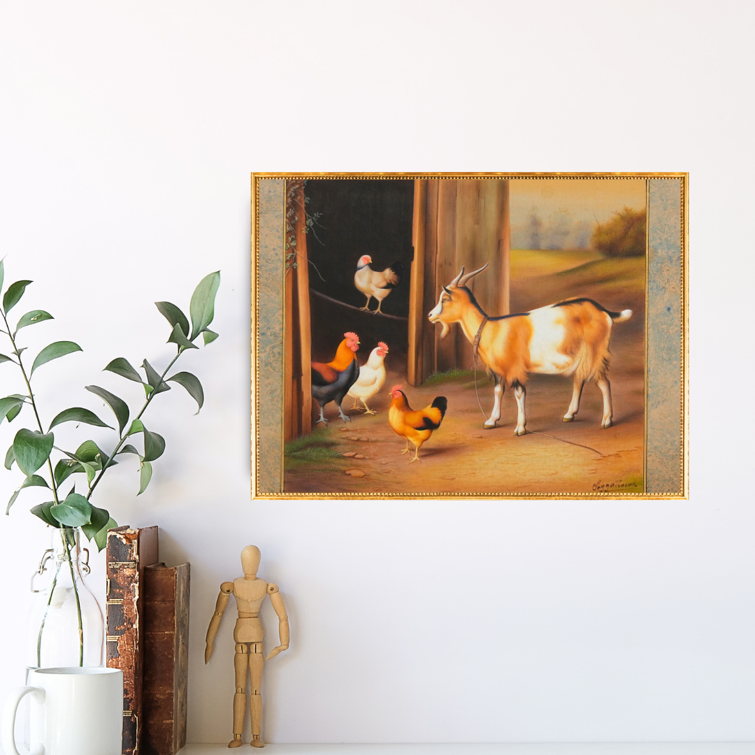 Keepers of the Hills' continues Prasad’s pastoral dialogue, this time with a composition that feels both observational and intimate. A solitary goat meets the gaze of a small flock of chickens near the edge of a wooden barn, their postures frozen in a moment of silent exchange. The golden-brown light washes over them, soft and contemplative, as if the afternoon has paused to listen. What stands out here is Prasad’s attention to detail — his ability to infuse ordinary rural creatures with dignity and awareness. Every feather, every wisp of fur is articulated with miniature precision, and yet the mood transcends detail: it feels like a meditation on balance and coexistence at nature’s gentlest edge.