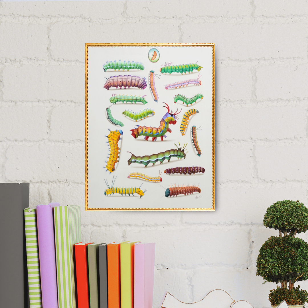 In 'On the Leaf’s Edge', Jaggu Prasad presents that which is small and easily overlooked, as a spectacle of colour and craft. Each caterpillar, painted in luminous shades of green, amber, lilac, and crimson, occupies its own narrow world. The variety of textures is refreshing: smooth segments, spiny ridges, and soft, translucent forms reveal the artist’s microscopic attention to structure. The circular cocoon motif at the top acts like a quiet reminder of what’s to come. A life mid-transition, resting before flight. The title speaks to the fragility of this moment: each caterpillar quite literally living on the edge, suspended between what it is and what it will become. Prasad’s work here honours the beauty that lies in the smallest act of persistence.