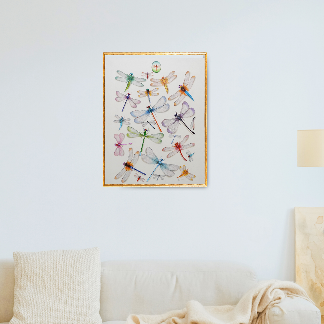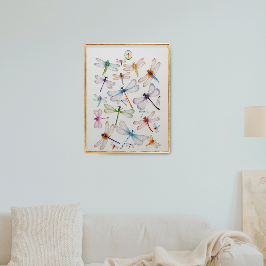 In 'Poems in the Sky', from Jaggu Prasad’s Fireflies Series, the artist turns his delicate brushwork toward the lyricism of light. A constellation of dragonflies, in hues of lilac, sapphire, emerald, and gold, fills the frame, each rendered with veins so fine they seem to hum with their own quiet radiance. The careful variation in size and colour creates a natural cadence, like stanzas suspended in air. Where earlier works in the series explored form and texture, this one leans toward composition, a visual poem written through repetition, symmetry, and soft gradations of tone. Every dragonfly carries its own rhythm, yet together they evoke a shared sense of grace and design.
