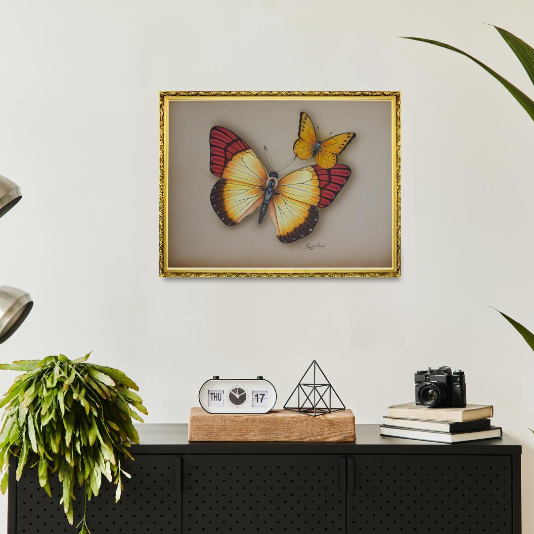 Radiant Companions by Jaggu Prasad captures a tender moment of harmony in nature. Two butterflies, painted in glowing hues of gold, crimson, and amber, appear to drift together in effortless synchrony. Their wings glisten softly against a warm, sepia-toned background, creating a sense of timeless serenity.