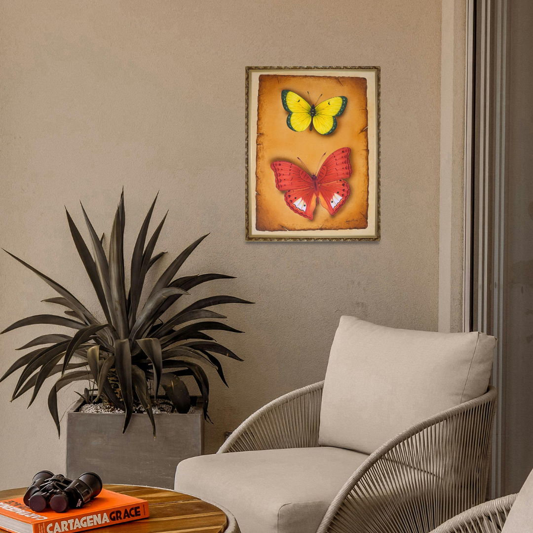 Radiant Flight by Jaggu Prasad celebrates the vibrant interplay of colour and light. The composition brings together two butterflies suspended in tranquil balance. The upper butterfly glows in soft yellow with hints of emerald at its edges, while the lower one unfolds in rich crimson, its wings delicately patterned with white and charcoal accents.