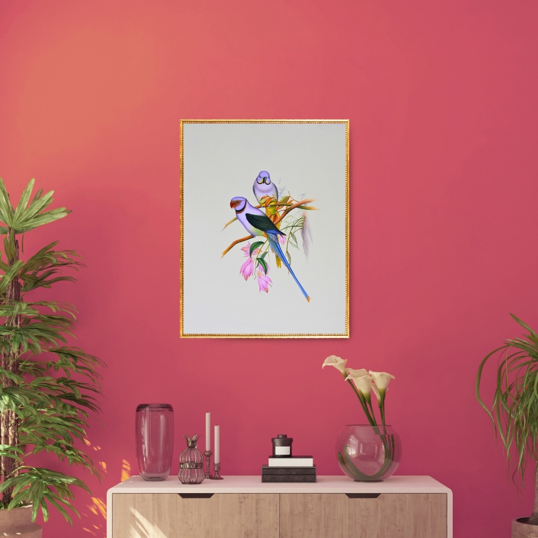 - Captures the grace and quiet bond of two parakeets in a natural setting.