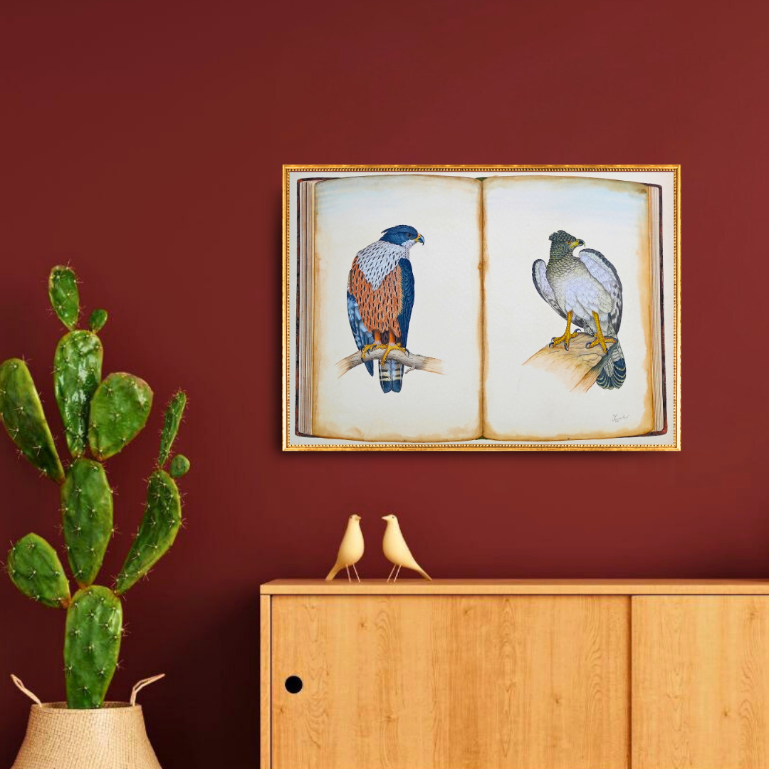 The striking and dashing figures portrayed as if in a book in this painting are indeed the worst nightmares of a serpent. And it's ironic, considering serpents are a nightmare too, for birds and small rodents. The hunter birds appearing in books in this painting seem to indicate it's a cautionary tale for serpents. The birds themselves are painted with extreme precision. To paint such minute details in miniature paintings is quite an ordeal, but Jaggu Prasad ji makes it seem natural and effortless.