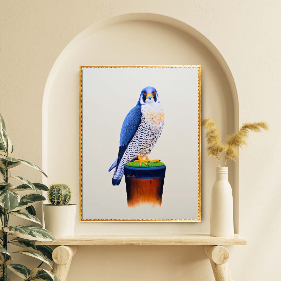 Sovereignty, by the master artist Jaggu Prasad, is full of vigour and colour. The bird in the painting is a peregrine falcon, a hunter known for its speed. The serene elegance with which the bird holds itself in the painting, along with its royal blue feathers and red eyes, gives it a look of utmost power and control. The title 'Sovereignty' proves itself apt as the bird radiates autonomy. Jaggu ji's excellence with colour schemes is evident in the dash of green the bird is perched, giving balance and contrast to the painting. At a closer look, the detailing on the chest of the bird looks like it encompasses the sky itself, making the bird seem all the more majestic.