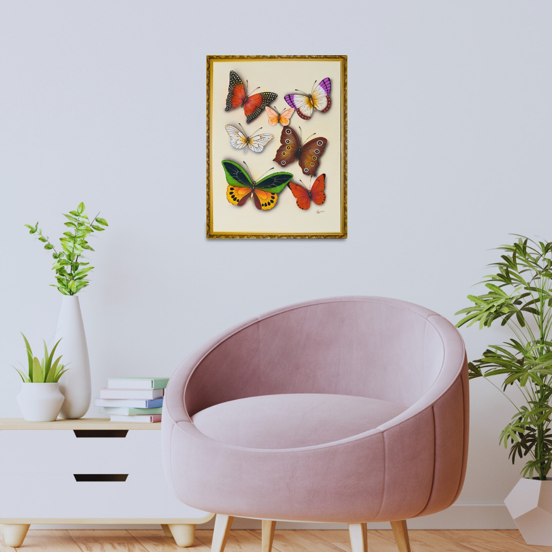 Symphony of Flight by Jaggu Prasad is a mesmerising display of natural rhythm and refined artistry. Six butterflies, each distinct in hue and form, come together to create a lyrical harmony of colour and motion. From the vivid greens and golden tones to soft blush pinks and warm amber, the composition radiates balance and grace.