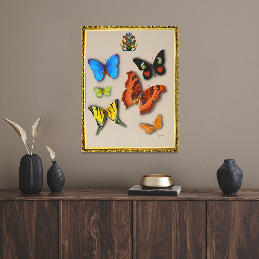 Through the artist’s expert miniature technique, the butterflies seem to hover gently above the surface, rendered with remarkable realism and luminous depth. The subtle crest above them adds a touch of heritage, linking nature’s splendour with timeless artistic tradition.