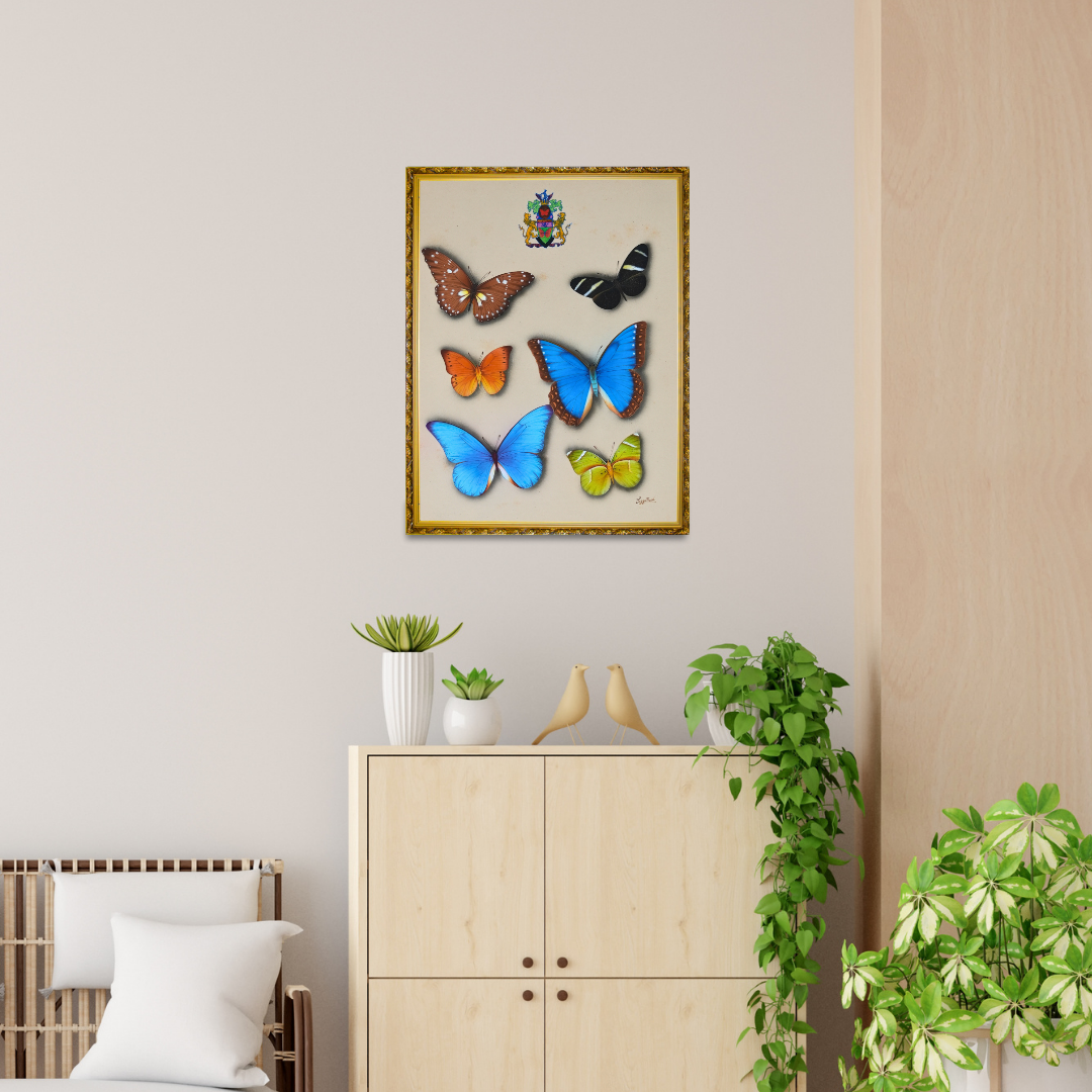 Symphony of Wings by Jaggu Prasad is a luminous celebration of colour, balance, and motion. Seven butterflies, each distinct in hue and form, appear suspended in perfect harmony against a pale, serene background. Shades of cobalt blue, amber, chestnut, lemon green, and soft black converge to create a radiant visual rhythm that evokes freedom and grace.