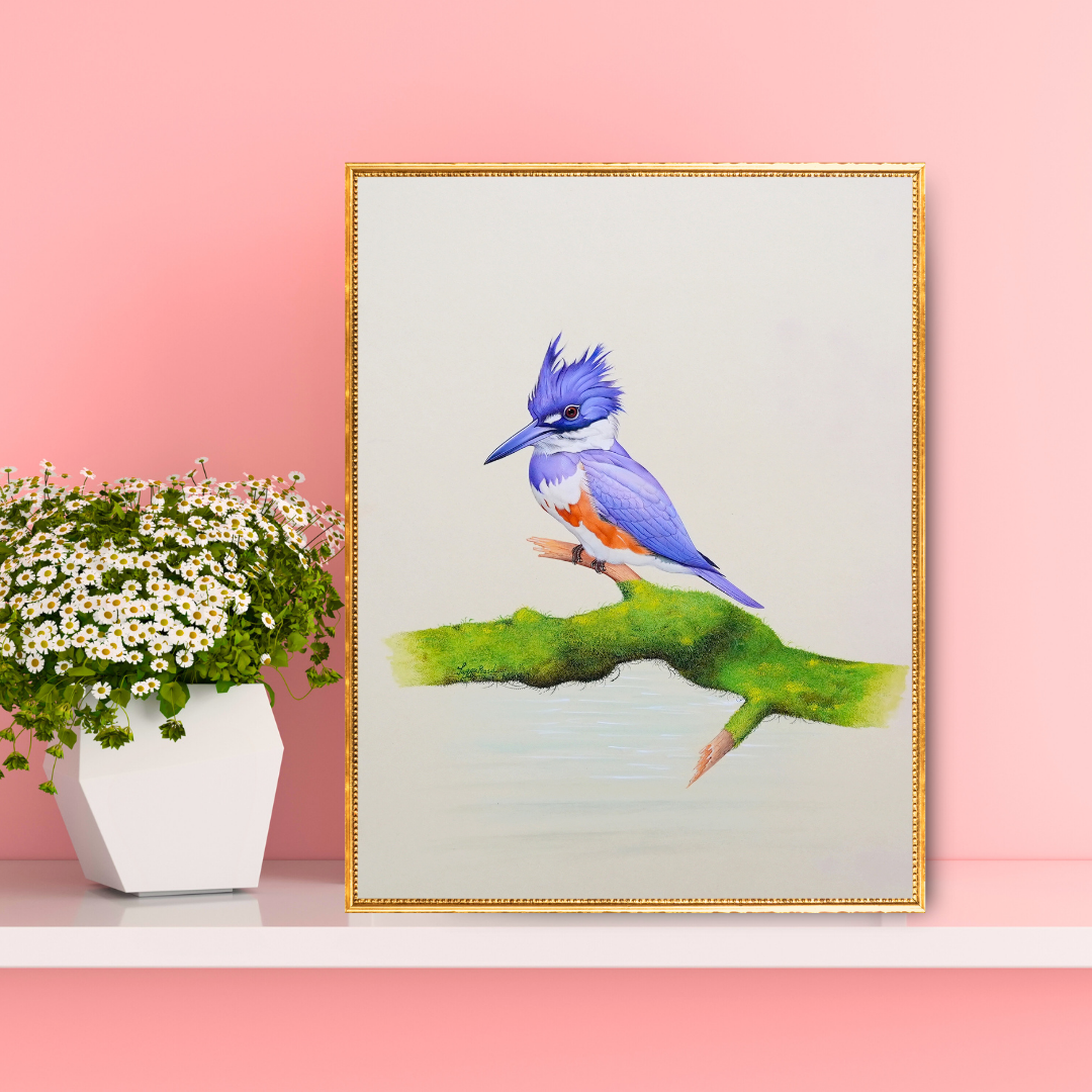 In 'The Fragile Pause', Jaggu Prasad captures a fleeting instant of a silence that is heavy with an abated breath. The female belted kingfisher is resting delicately on a slender branch, its small frame, painted with fine layers of russet, ochre, and white, glows softly against the bright green of the mossy branch. This heavy moss on the branch tells us it's monsoon, the time for blossoms and the mating season. The bird's eyes look unfocused, as if its attention is more on something else – perhaps on the expectance of an answer to its mating call? Female belted Kingfishers call continuously from their perch, while the males fly back and forth on their beck and call.