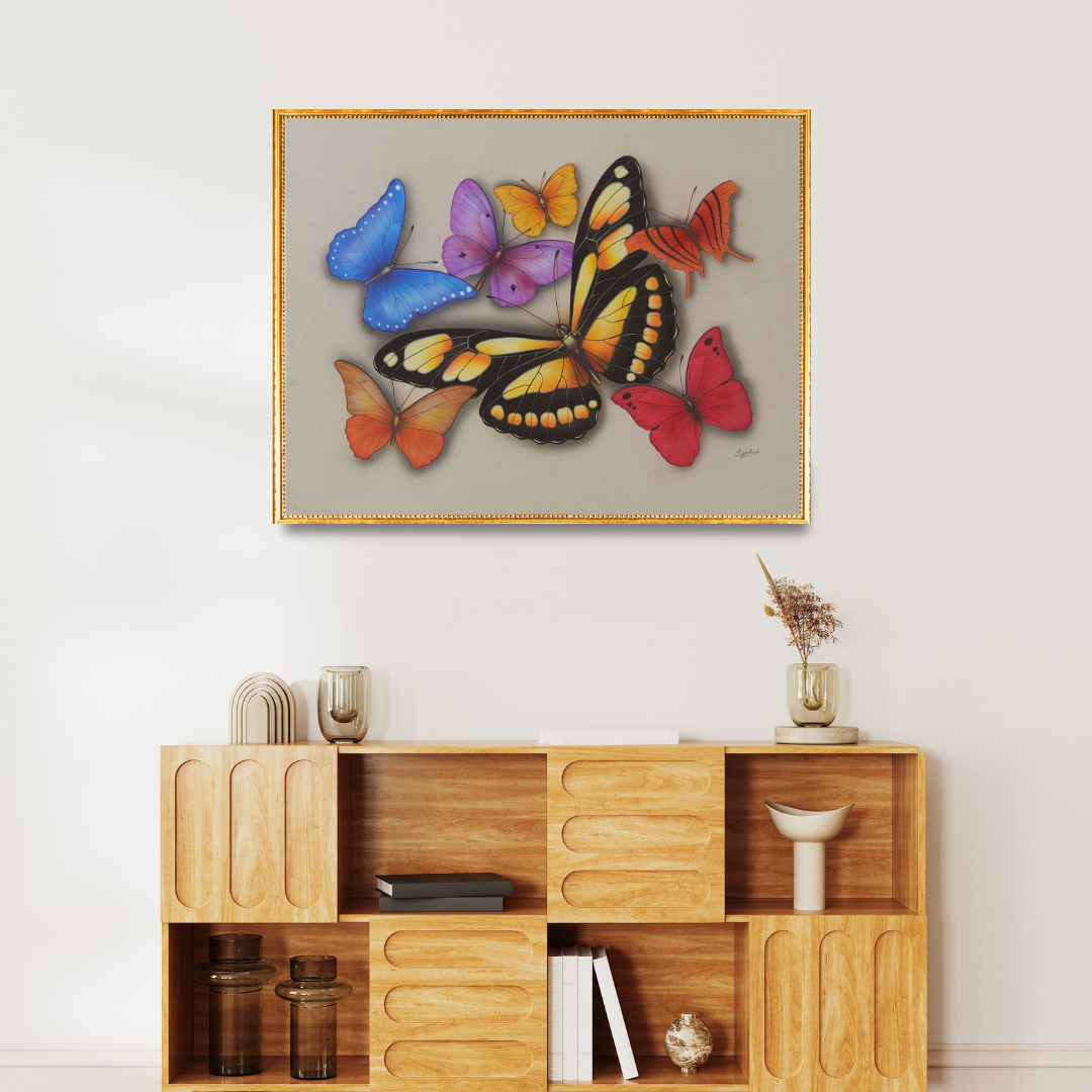 The Golden Soar by Jaggu Prasad is a radiant portrayal of movement and light, where butterflies glide across the canvas in a vibrant display of colour and harmony. Dominated by a majestic yellow-and-black butterfly at the centre, the composition radiates warmth and vitality, while hues of blue, violet, red, and orange weave together in a graceful chromatic balance.
