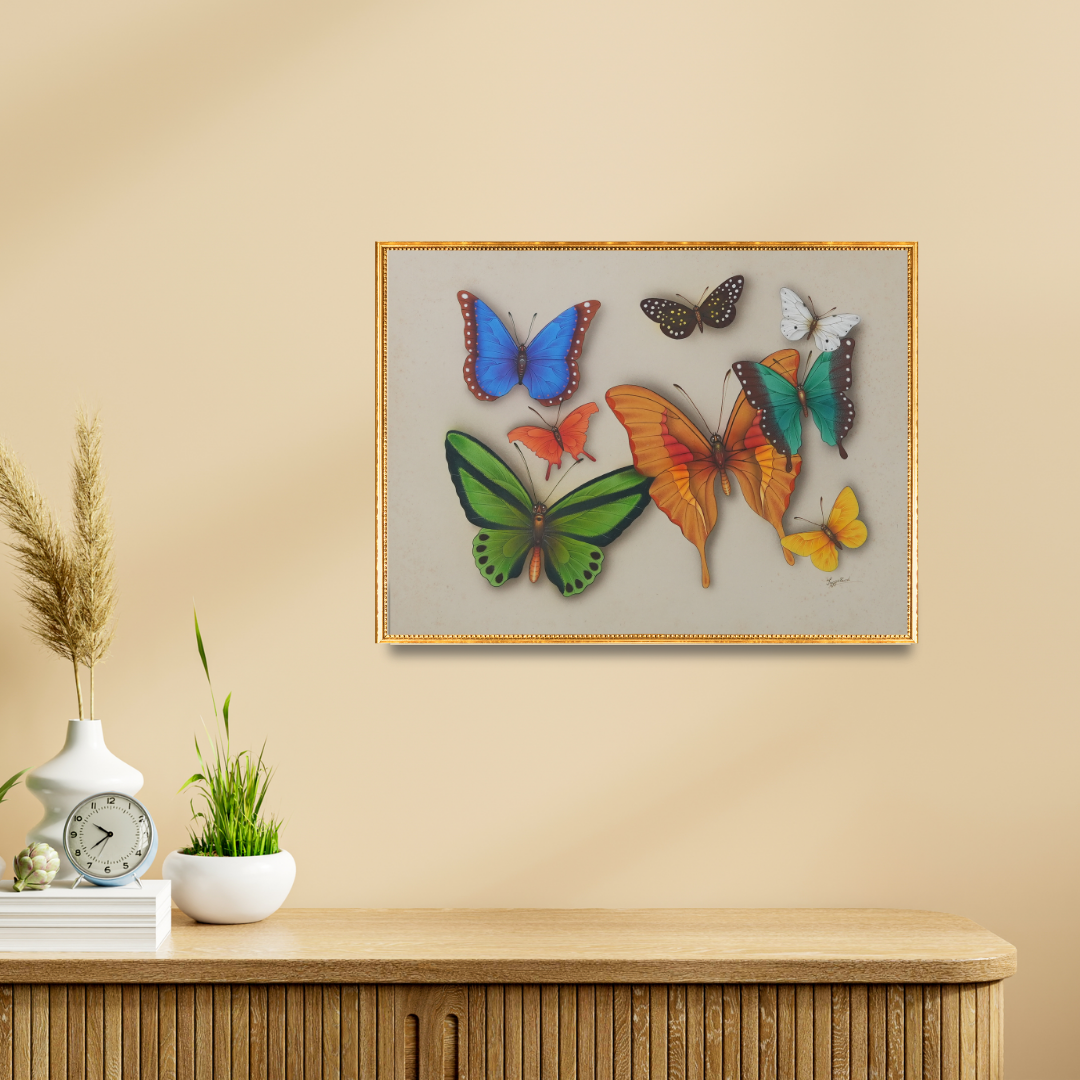 The Verdant Flight by Jaggu Prasad unfolds as a graceful ballet of butterflies in motion, their wings alight with hues of emerald, amber, cobalt, and gold. Each element of the composition is delicately balanced, showcasing a vibrant dialogue between colour and form.