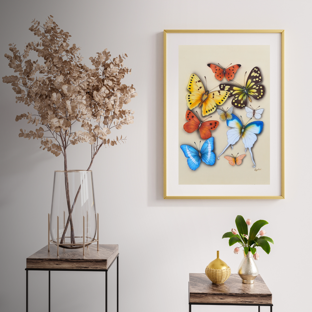 Each butterfly is rendered with remarkable precision and depth, showcasing the artist’s mastery of light and translucence. The gentle layering of colour and attention to anatomical accuracy make this piece both scientifically attentive and deeply poetic. Waltz of Wings is a visual symphony of elegance, vitality, and serenity.