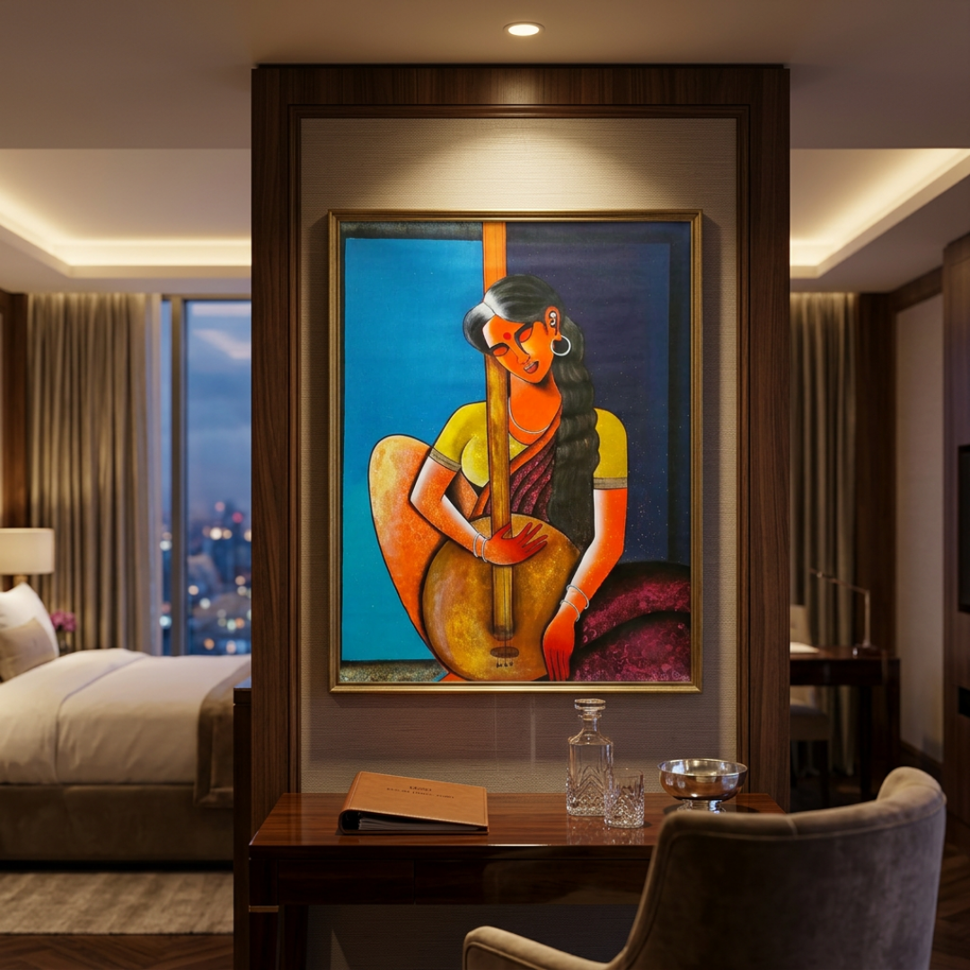 - The vertical tanpura neck bisecting the composition creates a structural boldness that is both visually striking and iconographically resonant, dividing the world into the known and the devotional.