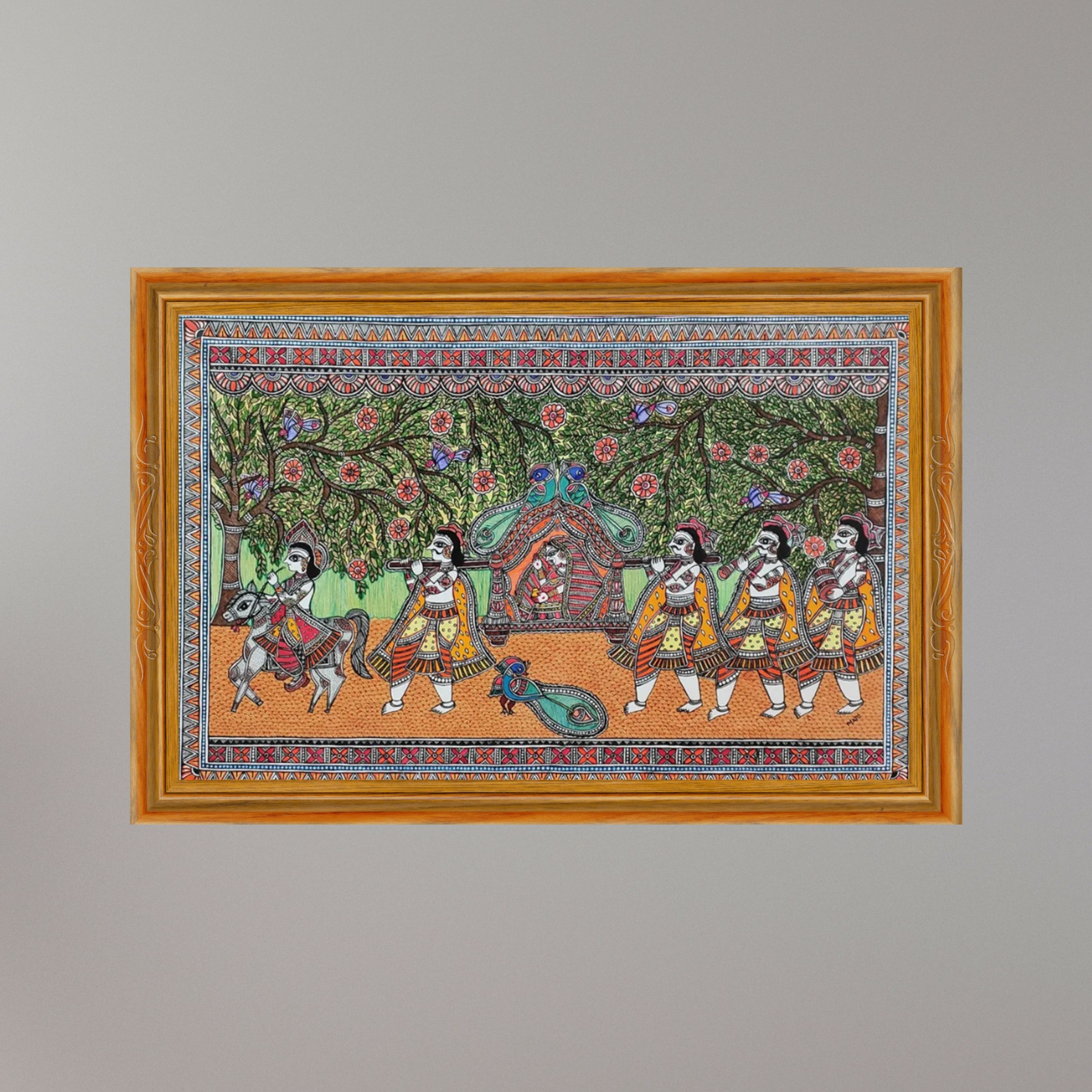 This vibrant Madhubani painting titled “Doli-Kahaar” beautifully depicts a tradi...